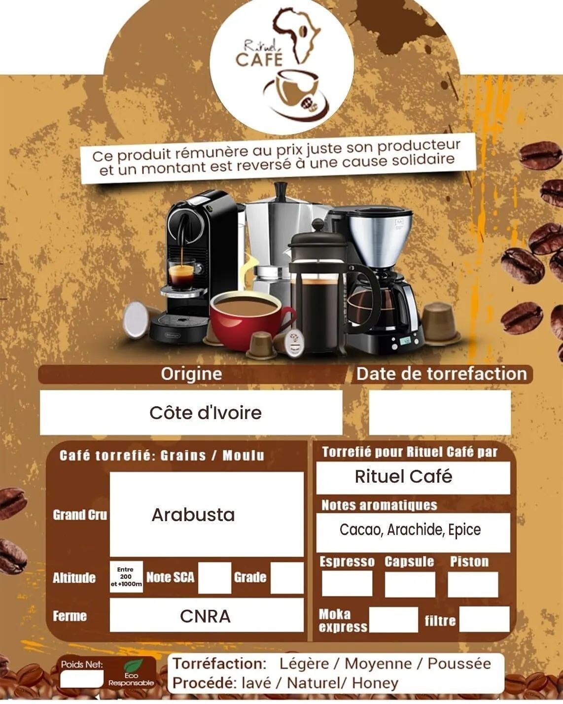コートジボワール産 アラブスタ (Arabusta) コーヒー豆 (焙煎済) Rituel Cafe Africa Coffee